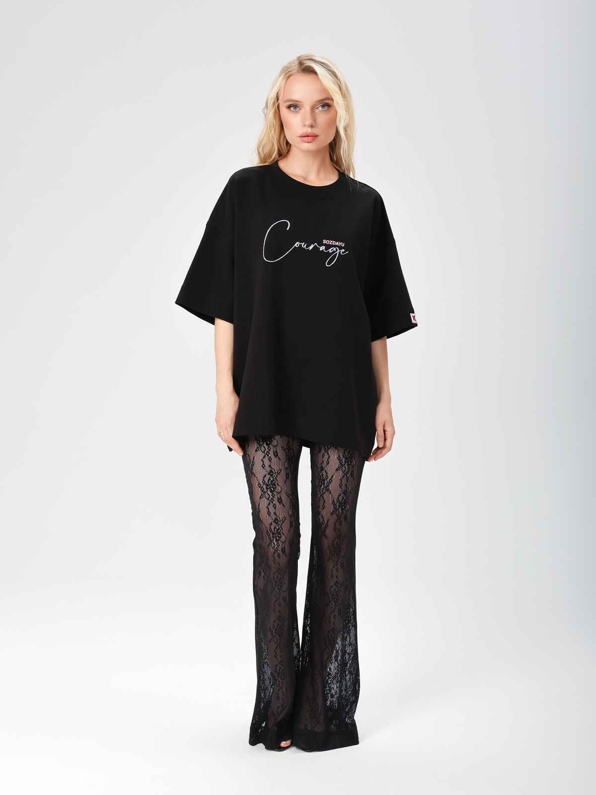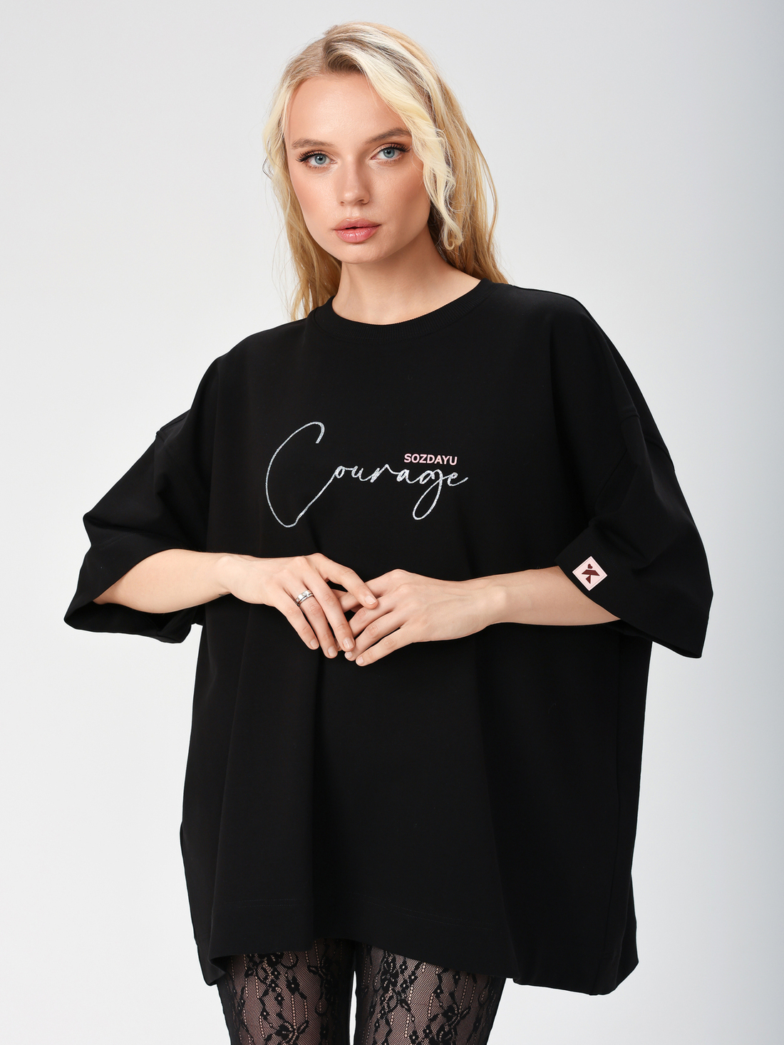 Футболка super over со спущенной линией плеча. Прорезиненное лого на рукаве. Свободный силуэт футболки создает необъятную легкость и свободу самовыражения.