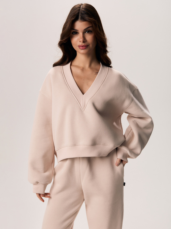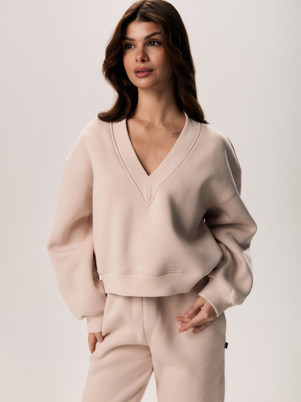 Свит сдержанного силуэта с V-образным вырезом. Выполнено из мягкого трикотажа футер 3-х нитка с начесом, который сохраняет форму и мягко облегает тело. Спущенная линия плеча. Манжеты рукавов из эластичного кашкорсе обеспечивают аккуратную посадку.