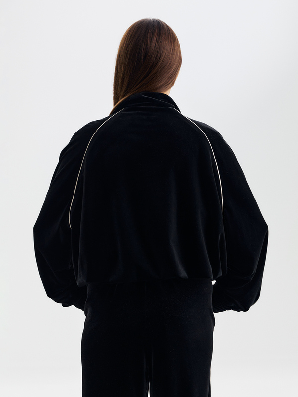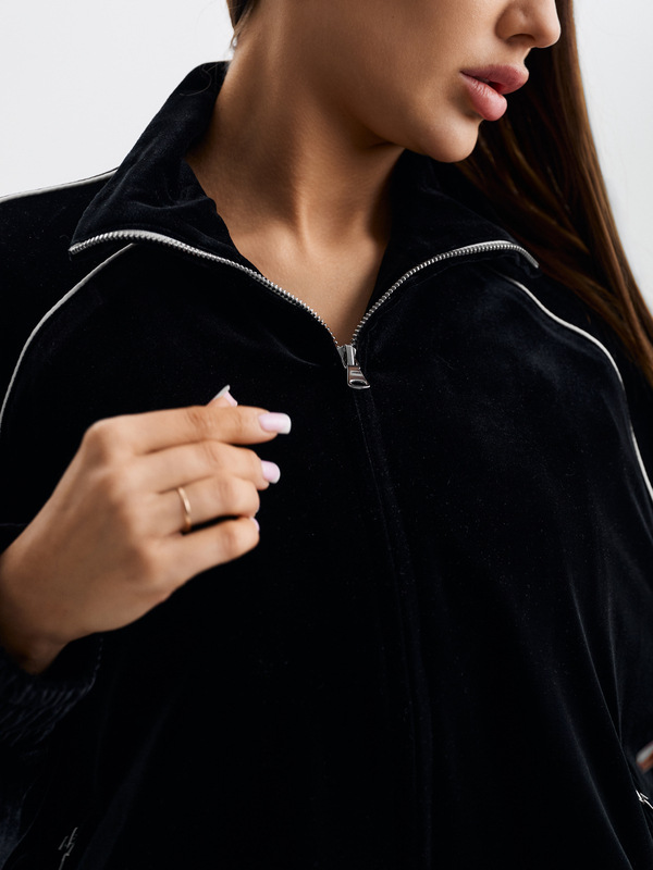 Олимпийка свободного силуэта выполнена из мягкой велюровой ткани. Манжеты рукавов и низ на эластичной резинке обеспечивают аккуратную посадку.