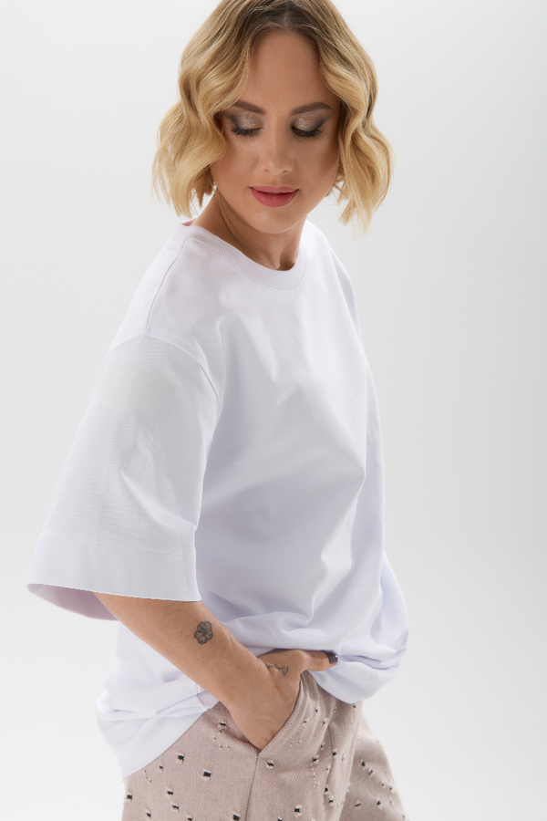 Оверсайз лонгслив со спущенной линией плеча. Модель отлично подходит для casual-образа и сочетания с разными предметами гардероба. На нижней части рукава расположено прорезиненное лого.