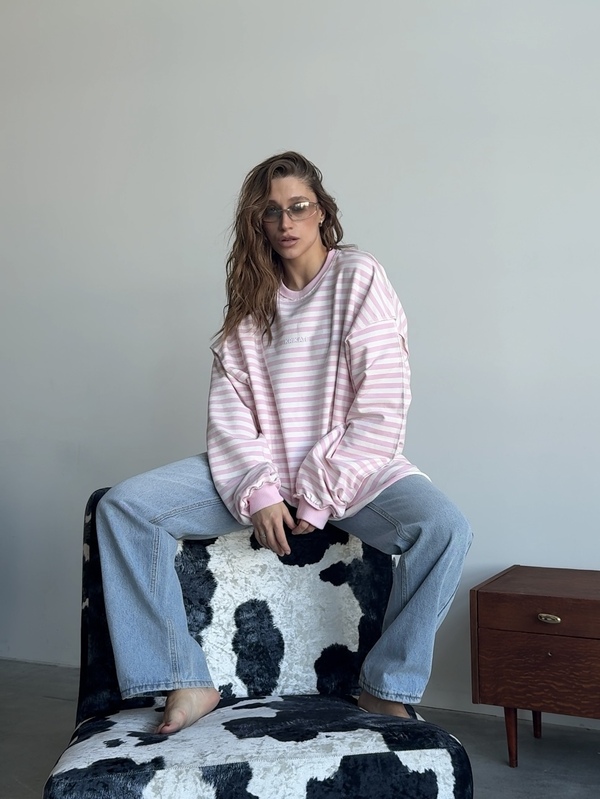 Лонгслив «SAMPLE» оверсайз силуэта. Манжеты рукавов из эластичного кашкорсе обеспечивают аккуратную посадку, а прорезиненное лого на груди добавляет современный стильный акцент.