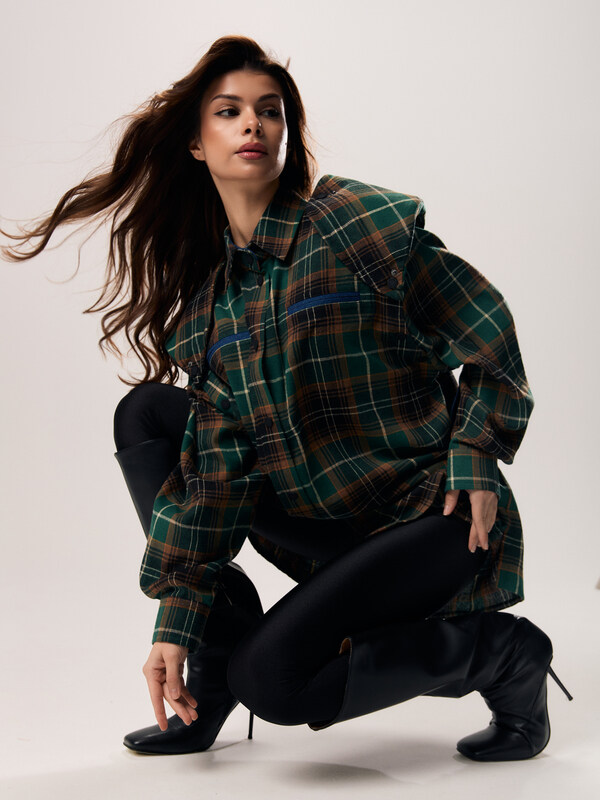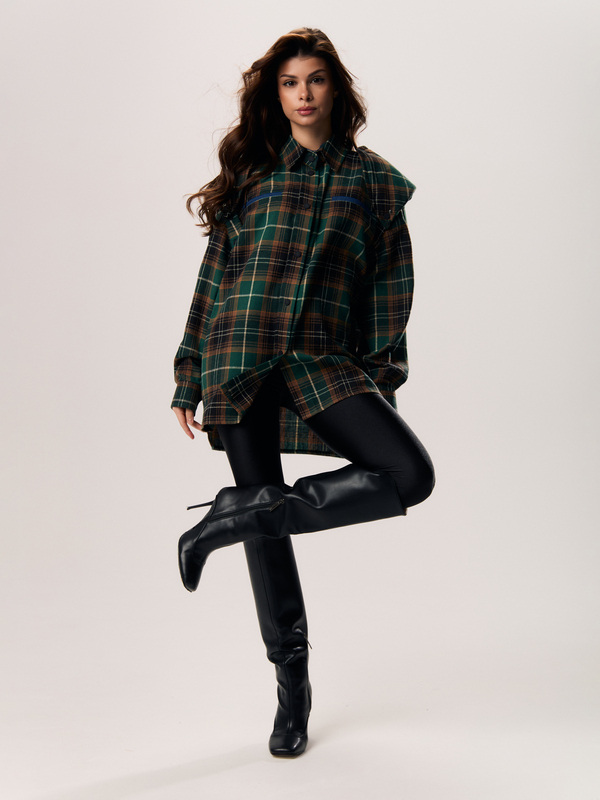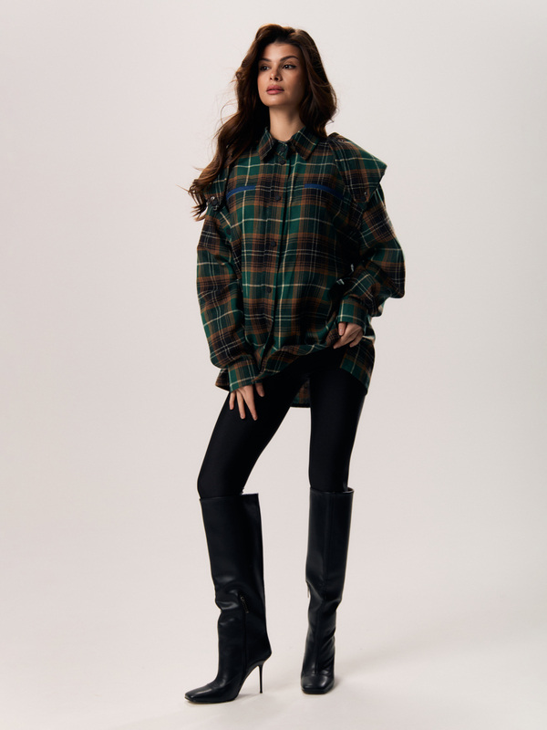 Рубашка оверсайз силуэта со спущенной линией плеча и классическим рубашечным воротником. Фигурная линия низа прекрасно дополняет расслабленный дизайн рубашки. Свободный силуэт не сковывает движения, поэтому рубашку комфортно носить как второй слой. Благодаря брендированным кнопкам вы легко можете менять длину рукава. Акцентные плечи съёмные.