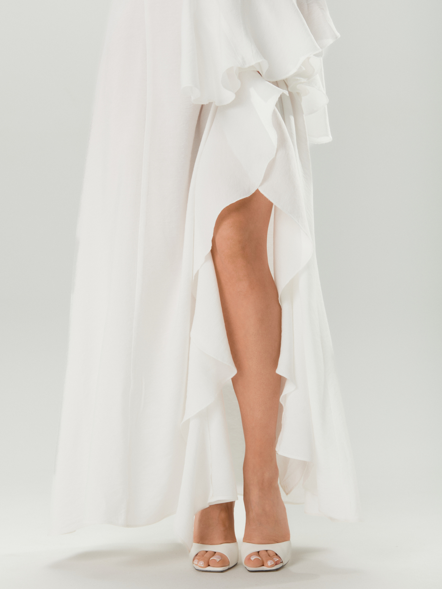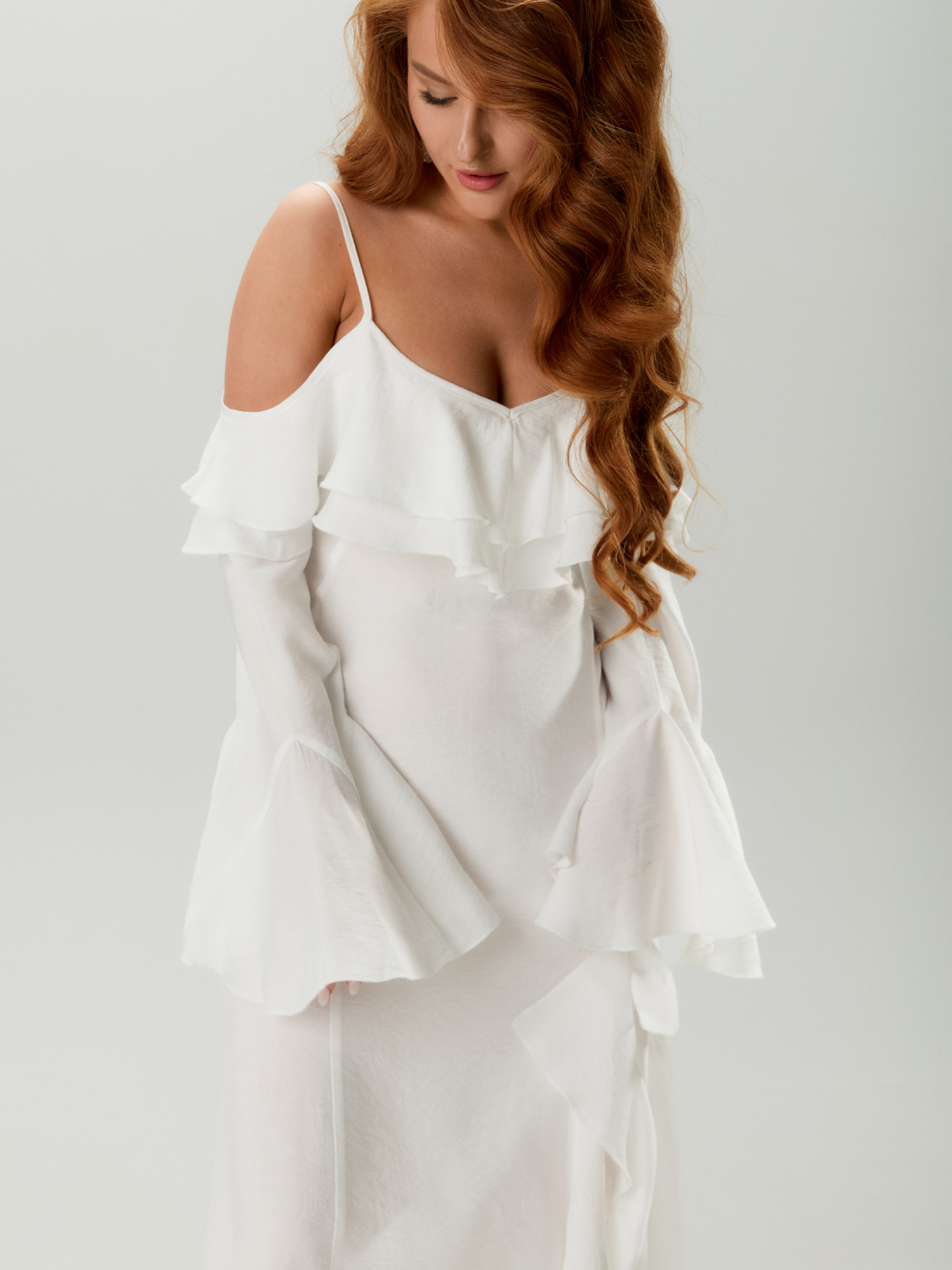 Платье «JE T’AIME» выполнено из легкой струящейся ткани. Платье в длине макси с длинным рукавом и на бретелях.