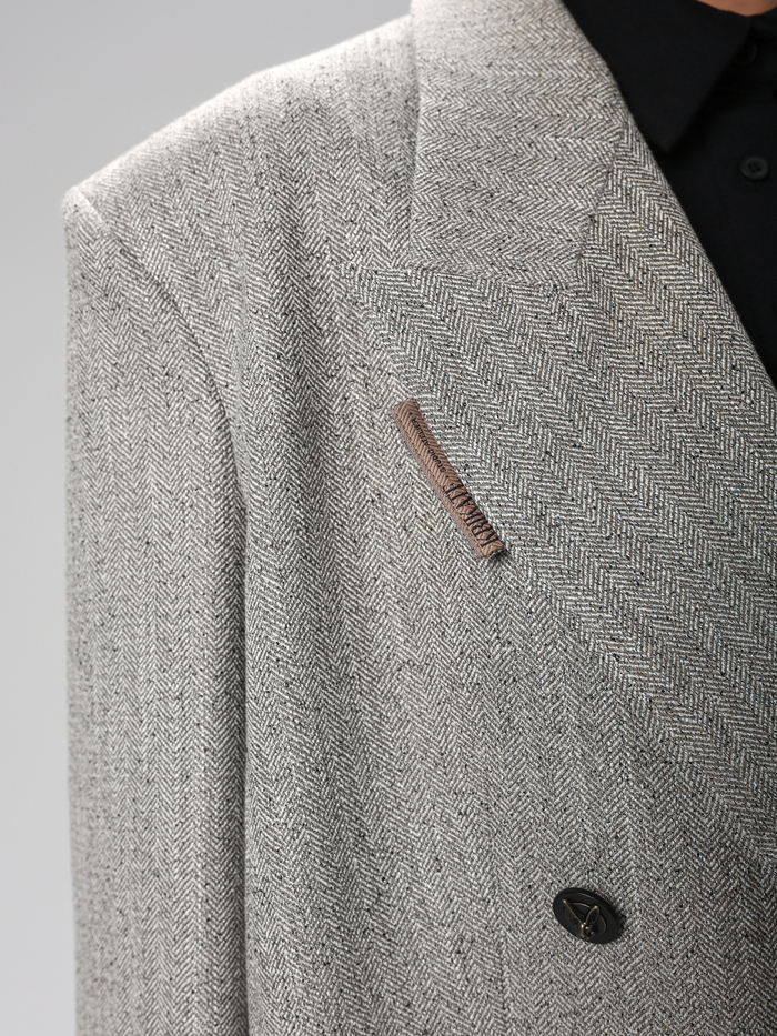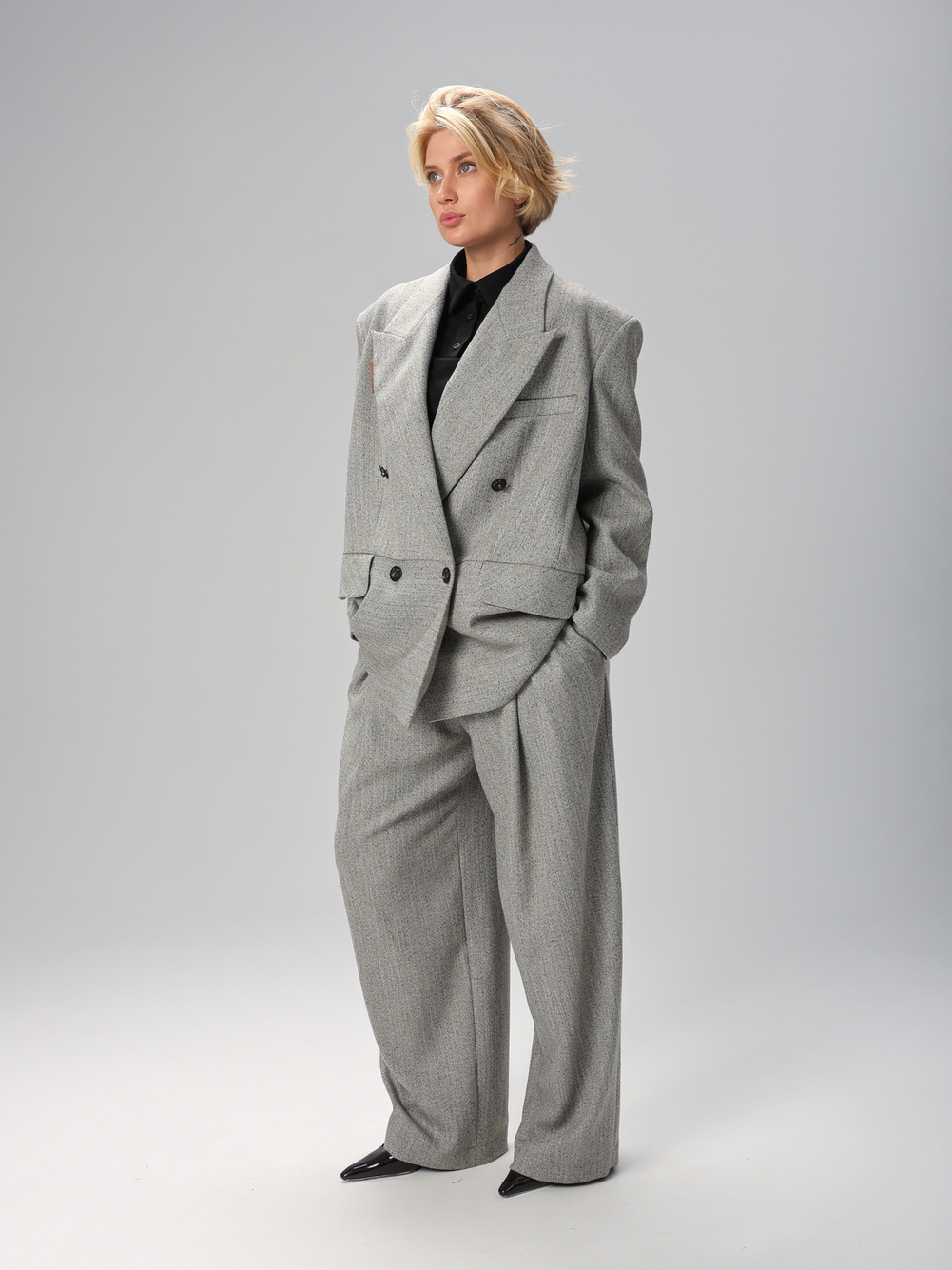 Двубортный оверсайз жакет с расширенной линией плеча. Воротник пиджачного типа. Рукава длинные втачные. В нижней части спинки расположен прорезной карман.