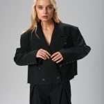 Укороченный оверсайз жакет с расширенной линией плеча. Воротник пиджачного типа. Рукава длинные втачные. Двубортный жакет с необработанным краем.