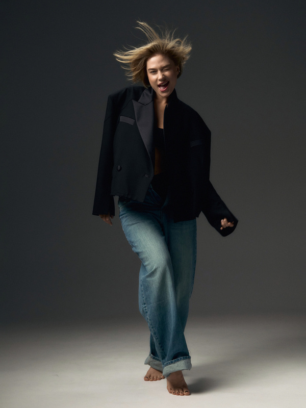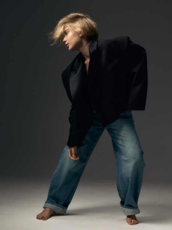 Оверсайз жакет с расширенной линией плеча. Воротник пиджачного типа. Рукава длинные втачные. Двубортный жакет с необработанным краем.