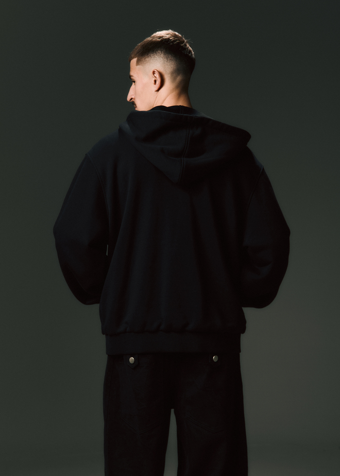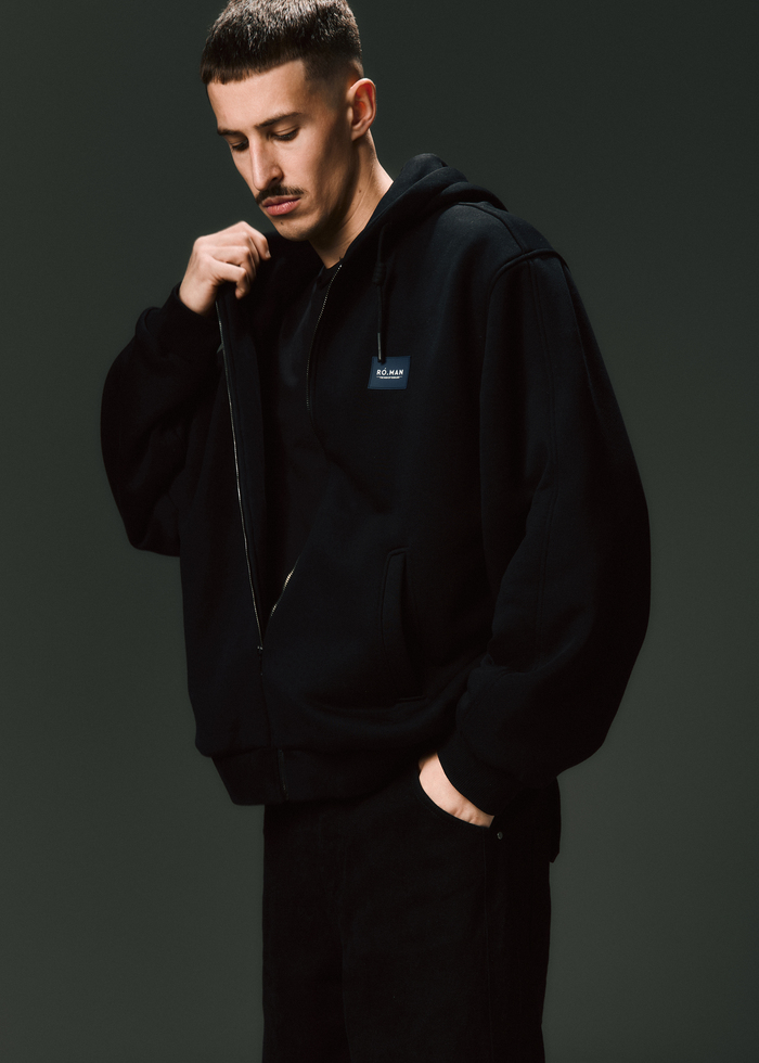 Оверсайз жакет с расширенной линией плеча. Воротник пиджачного типа. Рукава длинные втачные. Двубортный жакет с необработанным краем.